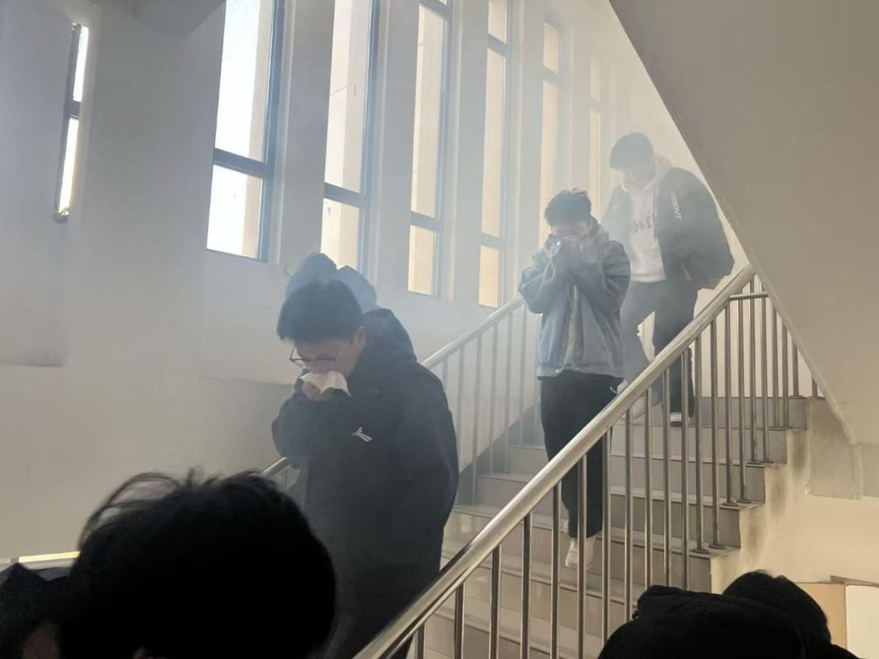 25日下午3时30分,演练正式开始。模拟火灾烟雾在宿舍楼内迅速弥漫,刺耳的消防警报随即响彻校园。同学们临“危”不乱,在志愿者引导下,迅速用湿毛巾捂住口鼻,采取弯腰低姿方式,沿着预定疏散路线快速、有序撤离。整个过程紧张有序,各环节衔接紧密,仅用时3分28秒,全体参演学生均安全撤离至指定区域,展现了良好的应急素养。