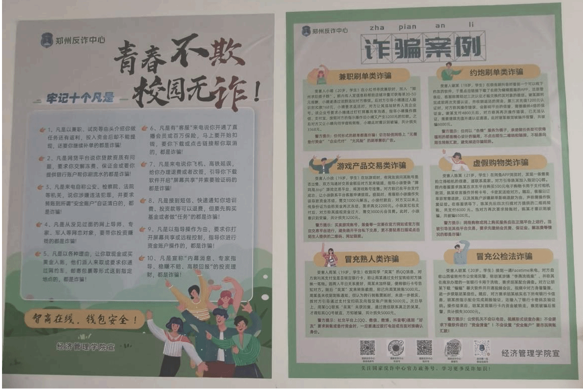 为进一步加强学生安全防范意识,筑牢校园安全防线,近日,经济管理学院围绕宿舍消防安全与反诈防骗主题,组织开展了一系列贴近学生、形式多样的宣传活动。通过张贴警示标语、发放融合安全知识的实用宣传品等方式,将安全教育的触角延伸至学生日常生活的细微之处。