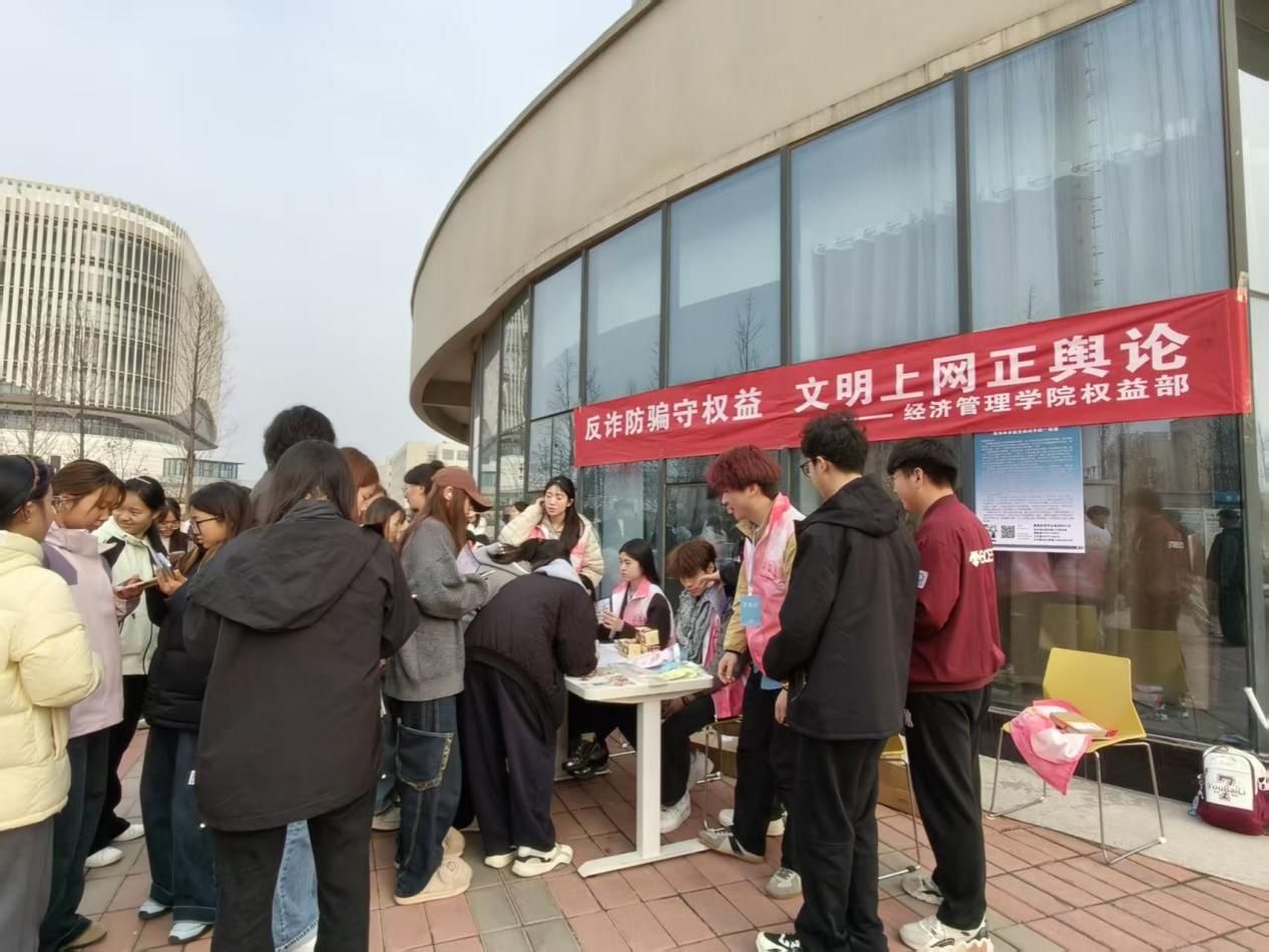 为进一步提升学生消费维权意识与反诈防骗能力,引导学生树立文明上网、理性发声的网络观念,3月16日,经济管理学院权益部依托“一站式学生社区”,在湖光苑门口举办“反诈防骗守权益·文明上网正舆论”主题嘉年华活动,学院全体在校学生积极参与。