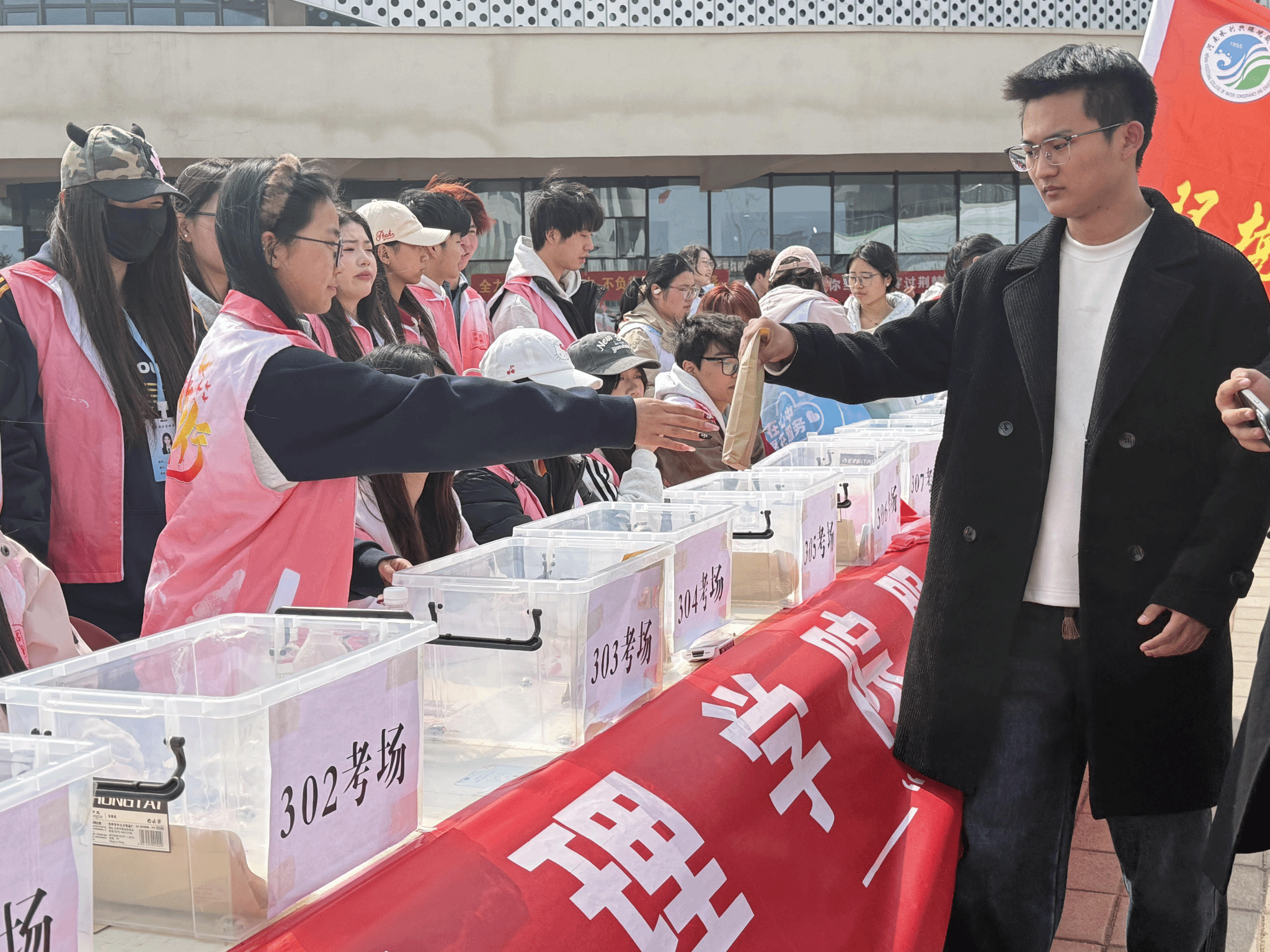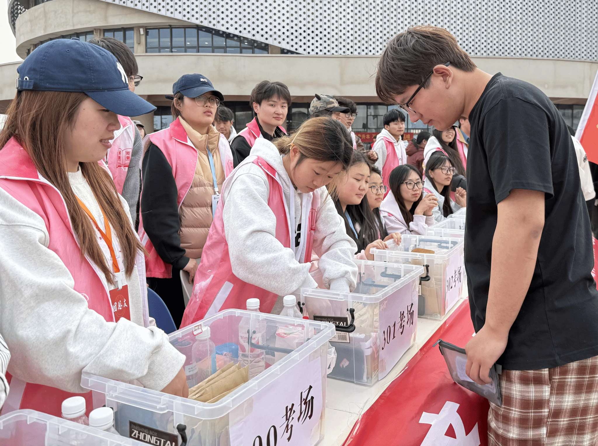 志愿服务过程中,“红心铸商 益路同行”志愿服务队分工明确、协同配合,展现出高度的组织性与责任感。在考场外及入场指定点位,志愿者们统一着装,以规范有序的方式协助考生完成物品存放、身份核验及入场引导等工作,妥善应对各类突发情况,确保考生顺利进入考场。同时,志愿者提前配合考务部门,细致完成考场布置、设施检查及环境保障等各项前期筹备工作,以严谨细致的工作态度为考试秩序平稳有序提供坚实保障。