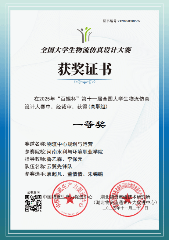 11月20日,由中国物流生产力促进中心、湖北物资流通技术研究所(湖北物资流通生产力促进中心)主办,上海百蝶教育科技有限公司承办的 “百蝶杯” 第十一届全国大学生物流仿真设计大赛总决赛圆满落下帷幕。我校经济管理学院选派的“云翼先锋队”和“智链追风队”在激烈的竞争中脱颖而出,斩获两个高职组一等奖。